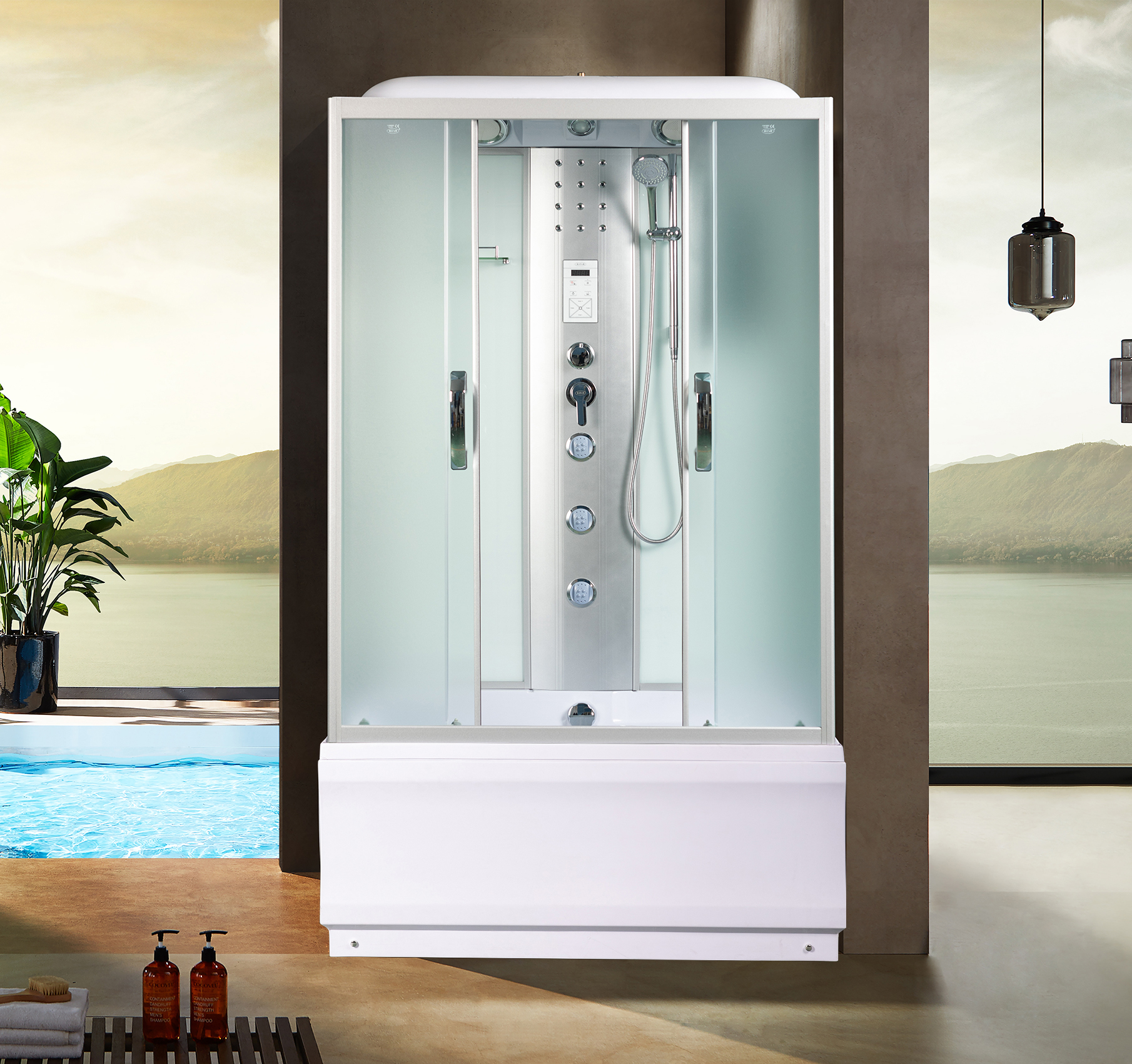 | Комплектация | зеркало||сиденье||сифон||Вентилятор||смеситель||крыша||поддон||полочка||верхний душ||верхний свет||динамик||центральная стойка||пульт управления||радио||г/м форсунки||штанга||ручной душ||лунный свет |